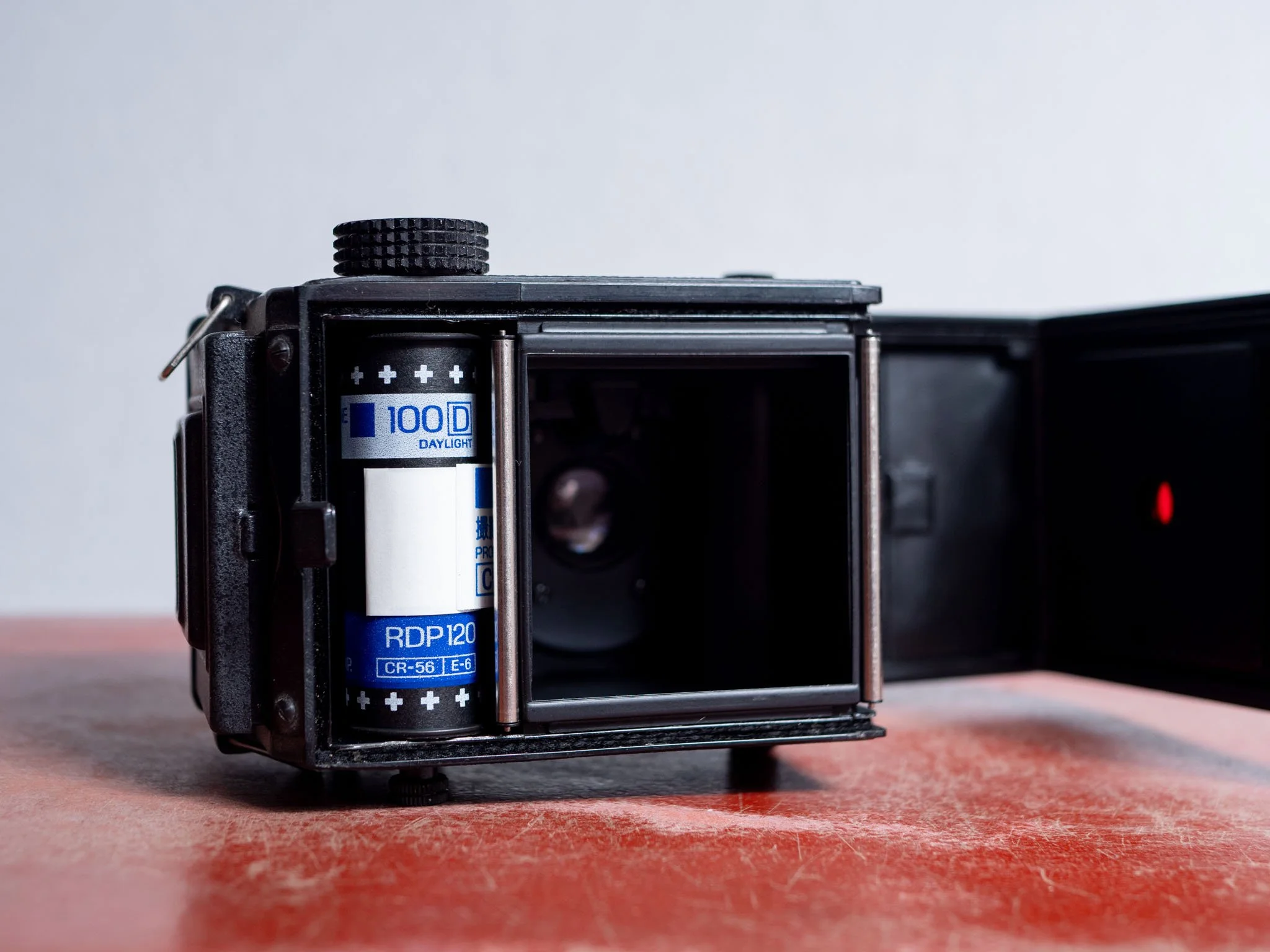 Once the film uptake spool is reliably advancing the film when you spin it, close the back of the back camera. Your camera should have a red tinted viewing window where you can see the paper backing of the film.