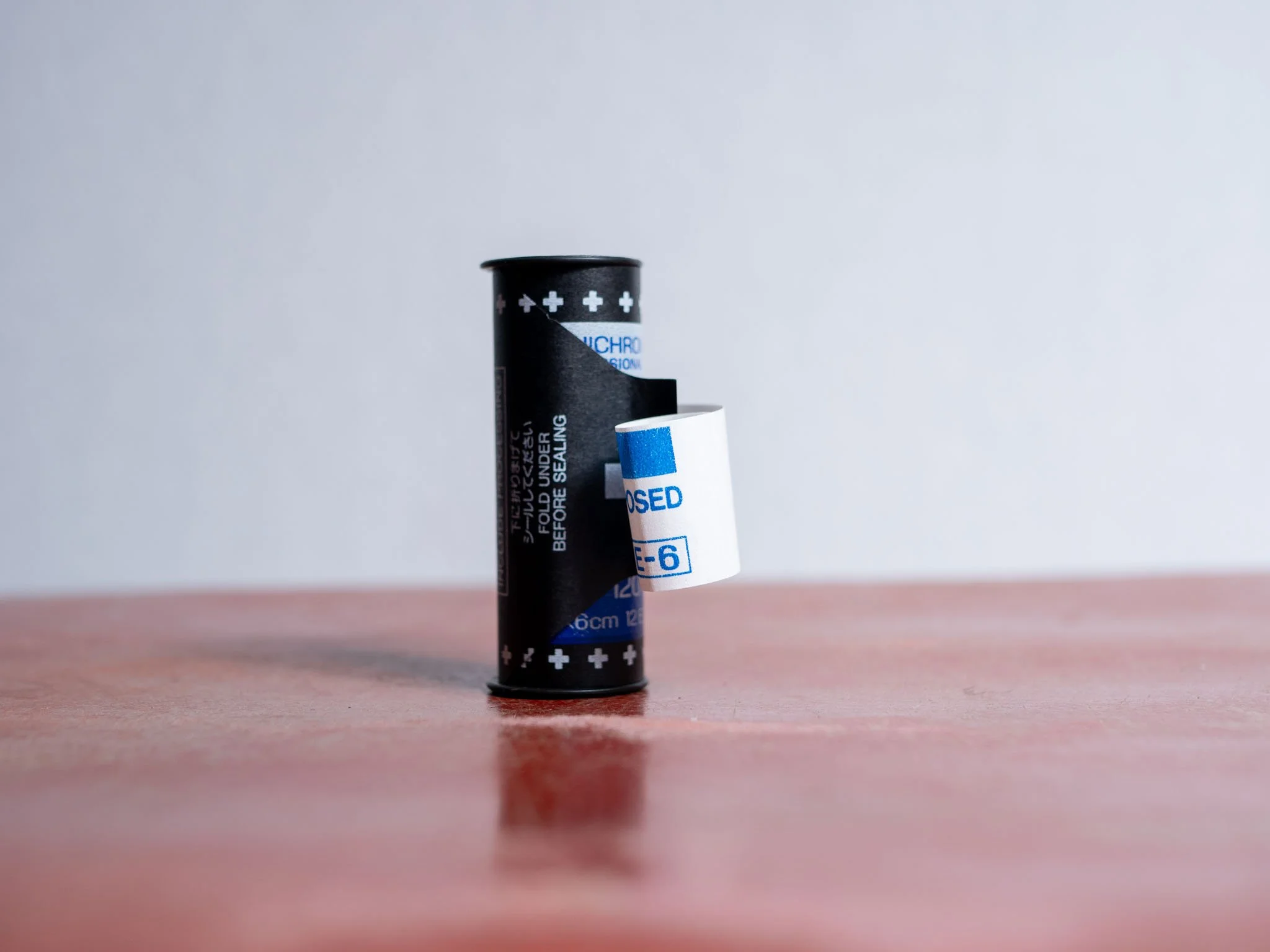 Either using tape, or the built in adhesive tab, seal the rolled film tightly onto the spool. Your film is now ready for development.